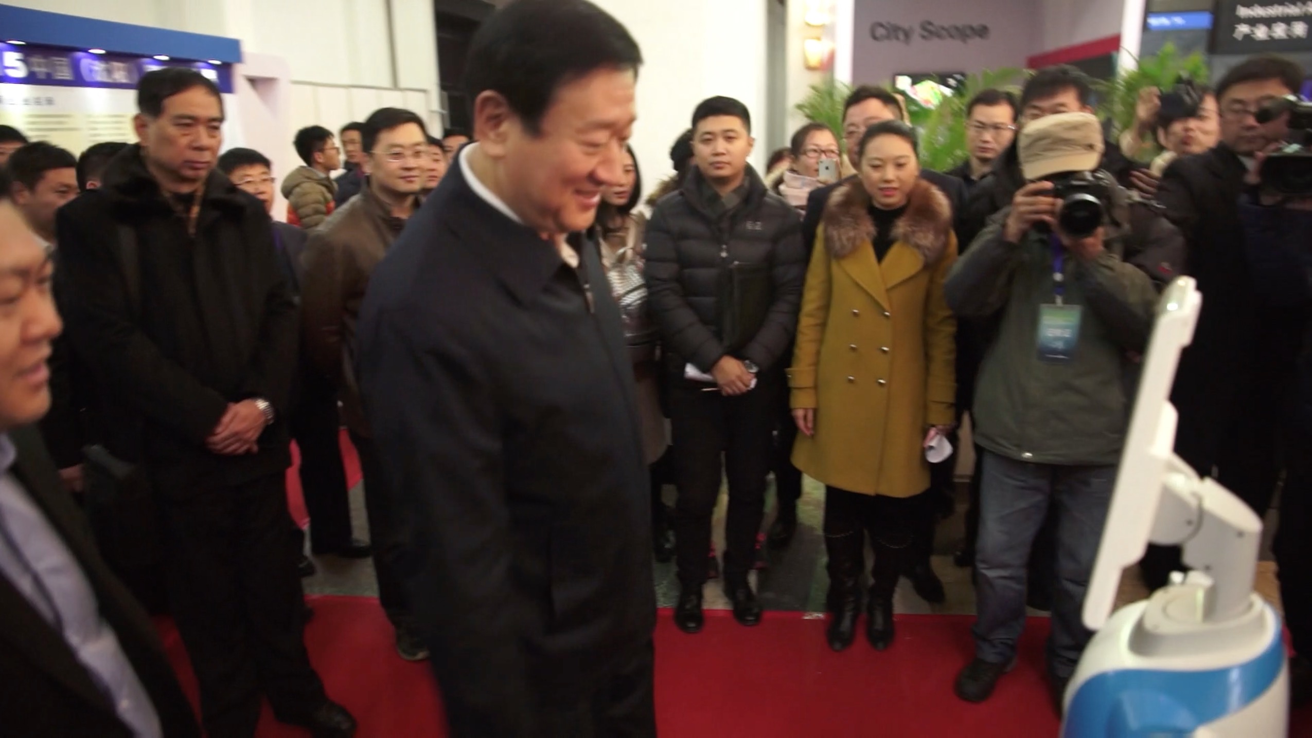 沈陽市市長潘利國與中安科股份智能服務型“替身”機器人互動