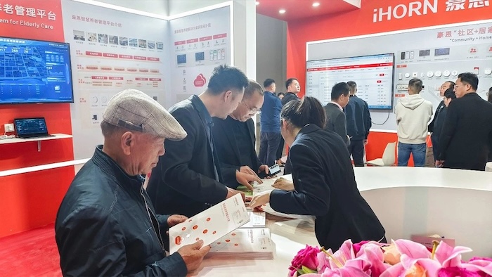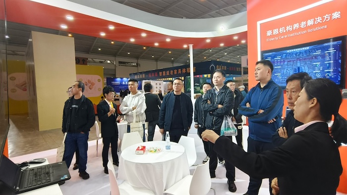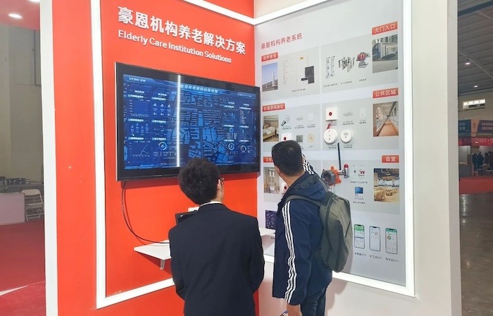 展會現場,豪恩展示了社區+居家、機構養老解決方案,以智慧養老綜合管理平臺為核心,統一管理各種前端智能養老設備,用科技手段幫助老人安心生活,幸福養老。