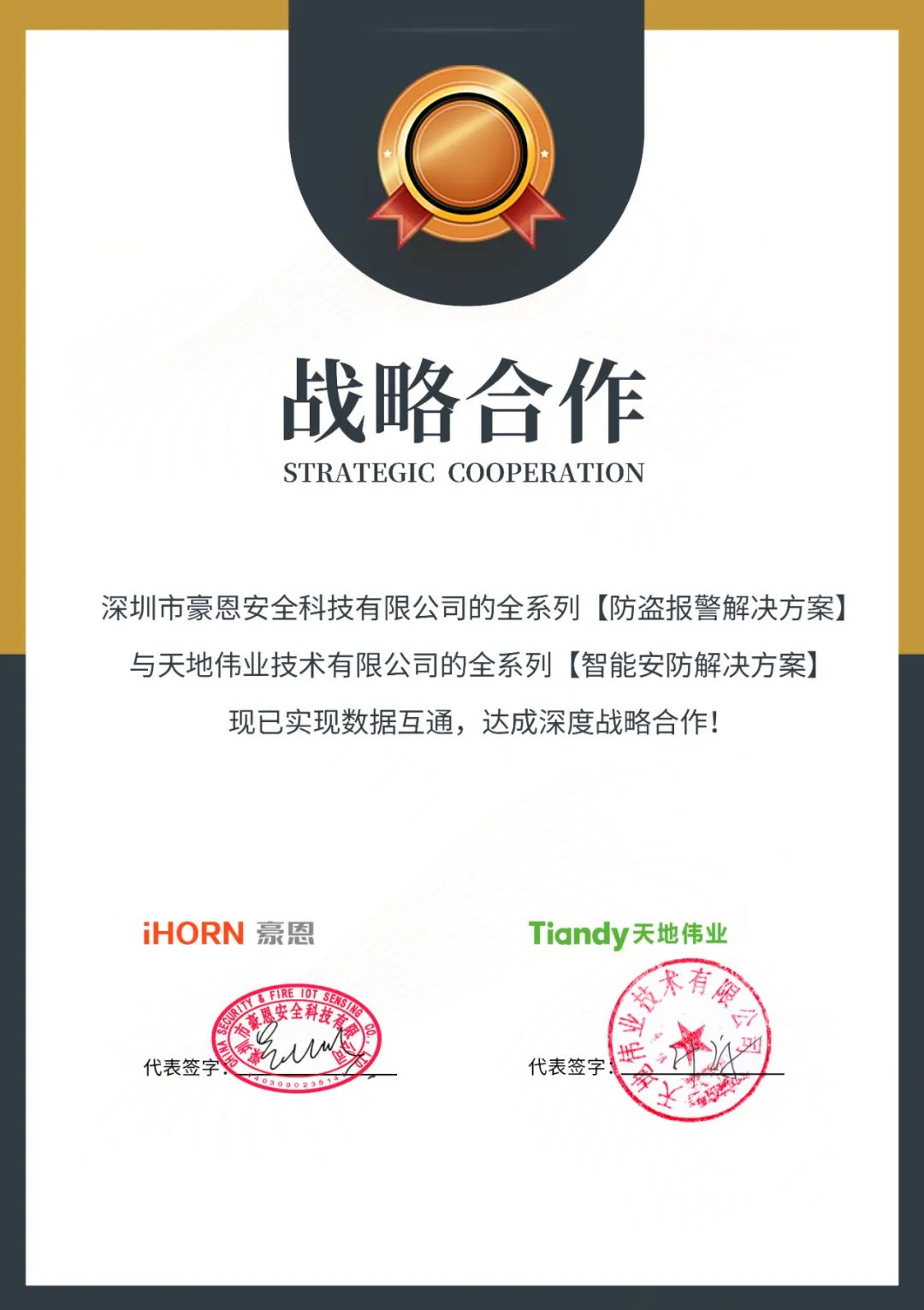 近日,中安科子公司 —— 深圳市豪恩安全科技有限公司(以下簡稱“豪恩”)的全系列防盜報警解決方案與天地偉業技術有限公司(以下簡稱“天地偉業”)的全系列智能安防解決方案已實現數據互通,達成深度戰略合作!