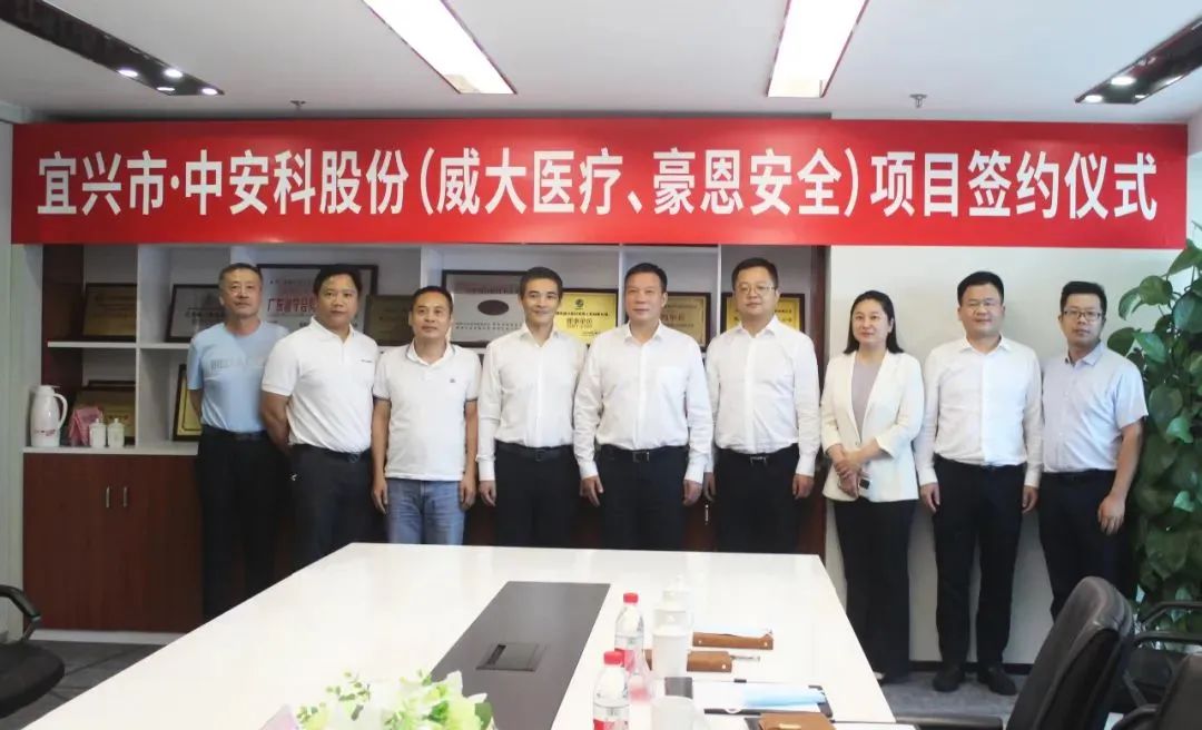 7月9日,中安科子公司(威大醫療、豪恩安全)與江蘇省宜興市陽羨生態旅游度假區項目合作簽約儀式在深圳市威大醫療系統工程有限公司隆重舉行。宜興市委書記封曉春、市委常委任飛等領導一行,與中安科股份集團董事長吳博文、威大醫療總經理李振東、豪恩安全總經理文洪等親臨簽約現場,共同見證并進行了項目簽約。