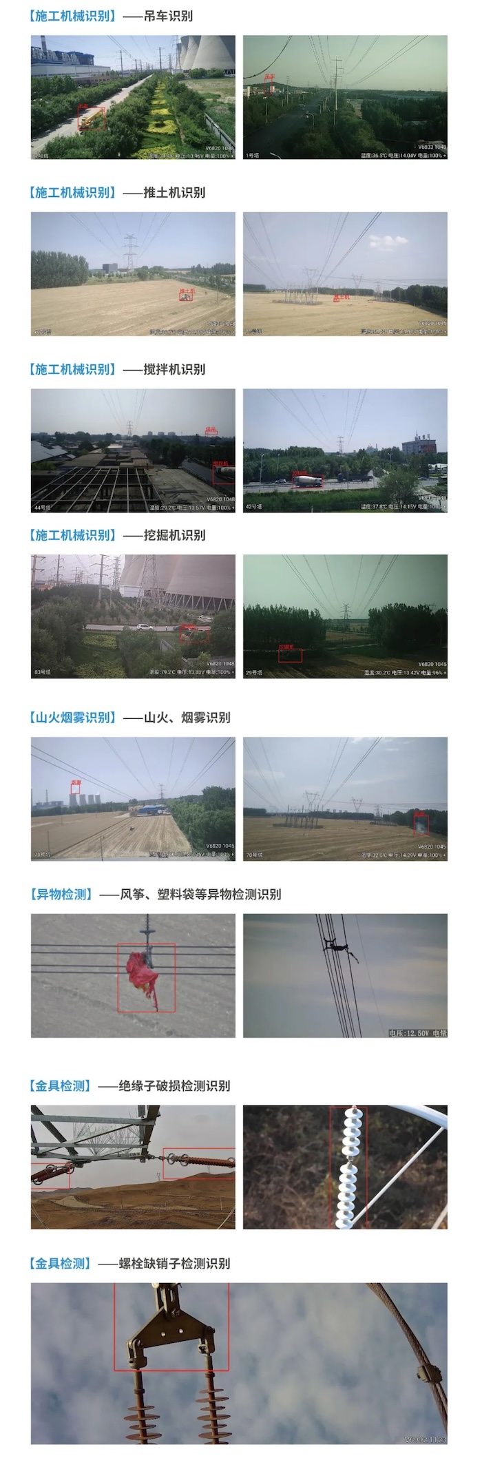 明景輸電線路AI算法可實現輸電在線監測、電力作業現場安監方面的多項AI分析識別功能。