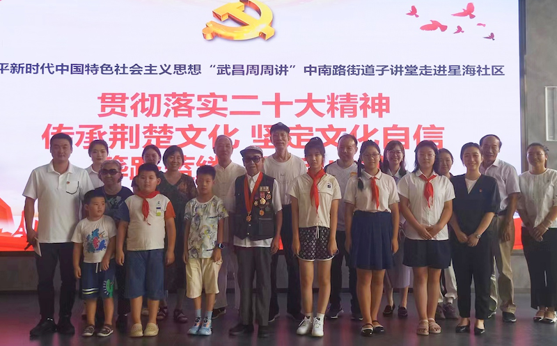 其次,湖北省文物考古研究院黨委書(shū)記、院長(zhǎng)方勤為大家講授黨課《貫徹落實(shí)二十大精神 做好荊楚文化的傳承發(fā)展》。社區(qū)九旬老黨員、志愿軍周學(xué)頤更是來(lái)到現(xiàn)場(chǎng),親身為大家講述其在抗美援朝戰(zhàn)爭(zhēng)上九死一生的經(jīng)歷,激勵(lì)大家熱愛(ài)祖國(guó)、感恩生活。