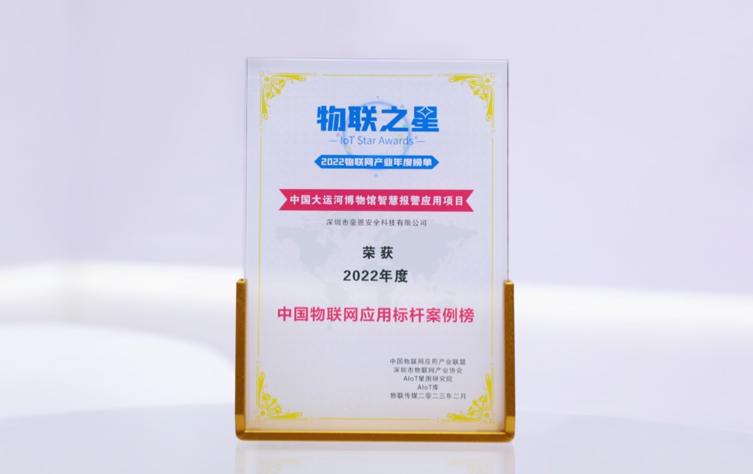 經過多月的激烈角逐,中安科子公司豪恩的中國大運河博物館智慧報警應用項目,從數百余家參評企業中脫穎而出,榮登2022“物聯之星”年度榜單之「中國物聯網應用標桿案例榜」,成為豪恩博物館安防報警解決方案中的典型代表案例。