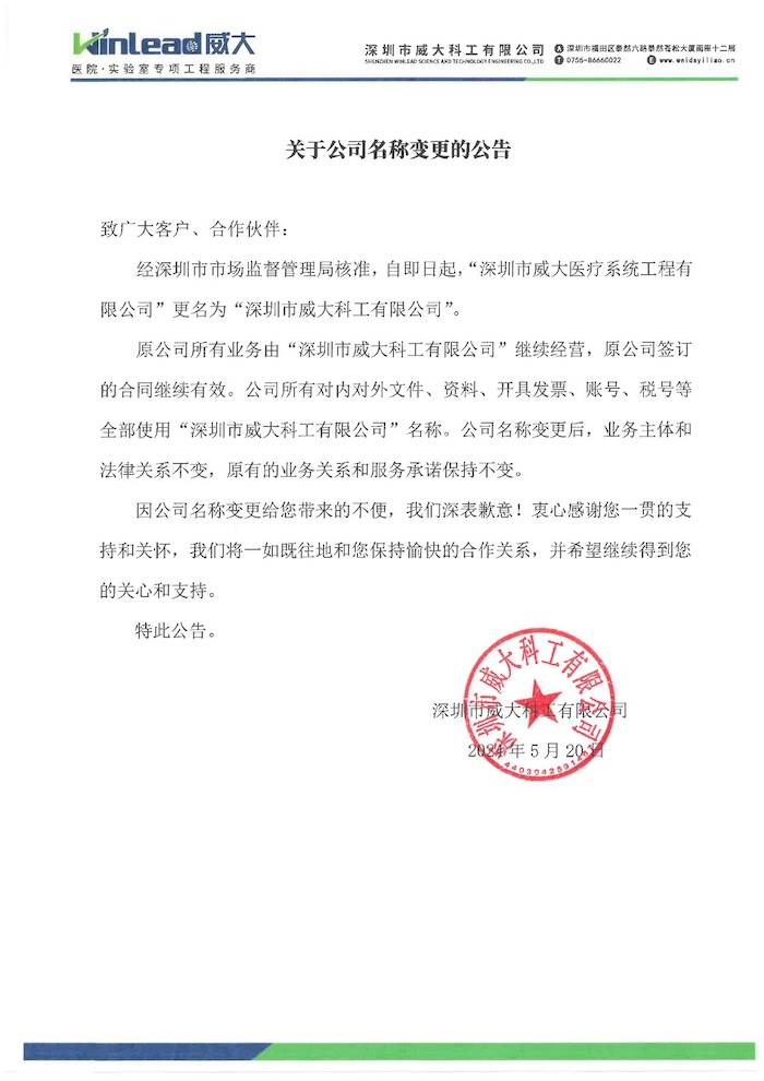 更名后,深圳威大科工所有對外文件、合同、資料、票據、賬號等將全部使用新名稱。公司業務主體和法律關系不變,原簽訂的合同繼續有效,原有業務關系和服務承諾保持不變。