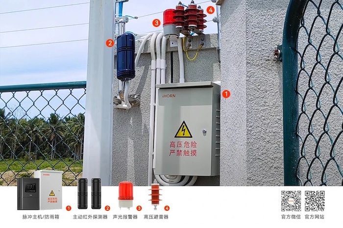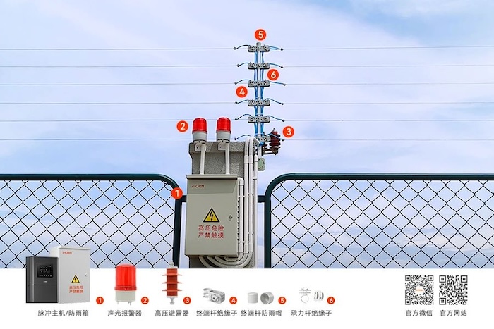 如遇強行入侵,電子圍欄將給予安全能量范圍內的脈沖高壓打擊,警告非法入侵者,動搖其攀越圍欄的能力與動機。同時,系統現場發出高分貝聲鳴報警,并與其它安防系統聯動(如報警主機、監控系統等),從而達到安全阻擋目的。