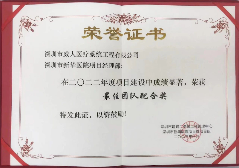 2023年1月13日,深圳市建筑工務署工程管理中心、深圳市新華醫院項目群項目組聯合召開了“2022年度新華醫院I標項目群年終總結暨優秀表彰大會”。在這場大會上,深圳威大憑借其精細化管理體系和真抓實干的工作態度,榮獲了“最佳團隊配合獎”、“優秀管理干部”等榮譽。這些榮譽的獲得,不僅是對深圳威大在新華醫院項目中杰出表現的認可,更是對其在智慧醫療領域專業實力的肯定。